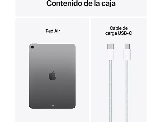- Contenido de la Caja: iPad Air y Cable de carga USB-C (1 metro). El adaptador de corriente no está incluido.