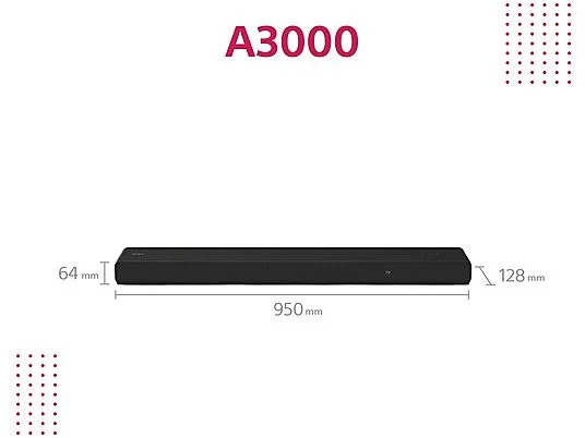 Disfruta de un sonido envolvente y cinematográfico con la Sony HT-A3000, una barra de sonido 3.1 canales con subwoofer integrado y tecnología de vanguardia para una experiencia auditiva inmersiva en películas, música y juegos.