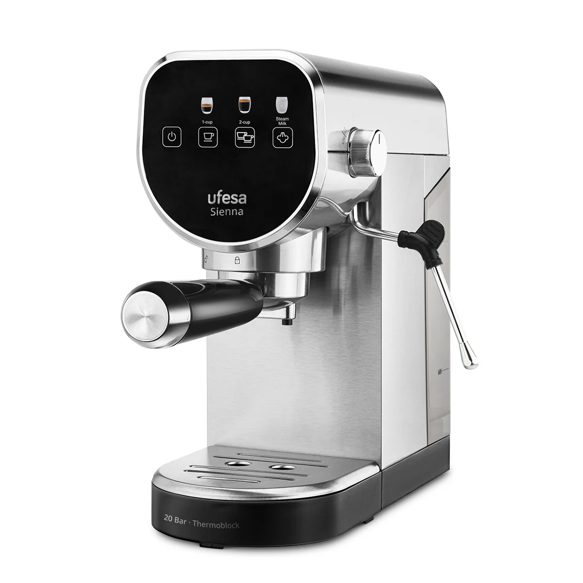Cafetera Espresso Ufesa Sienna – 20 bar, 1360 W, 2 Tazas, Depósito 0.9 L, Vaporizador Orientable, Inox