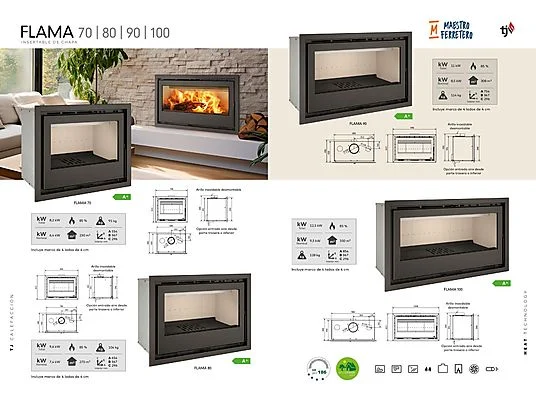 La TJ FLAMA 100 es una estufa de leña insertable de alto rendimiento diseñada para calentar grandes espacios con eficiencia y bajo consumo. Con 9,5 kW de potencia nominal y un rendimiento del 85,28 %, es ideal para viviendas de hasta 134 m² (350 m³), ofreciendo una distribución del calor uniforme y potente.
