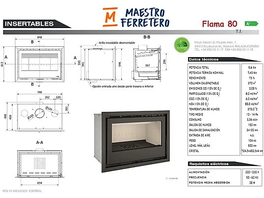 La TJ FLAMA 80 es una estufa de leña insertable diseñada para ofrecer una calefacción eficiente, limpia y potente. Con 7,4 kW de potencia nominal, un rendimiento del 86,1 % y clasificación energética A+, es ideal para calentar espacios de hasta 103 m² (270 m³) con un consumo reducido y una combustión más ecológica.