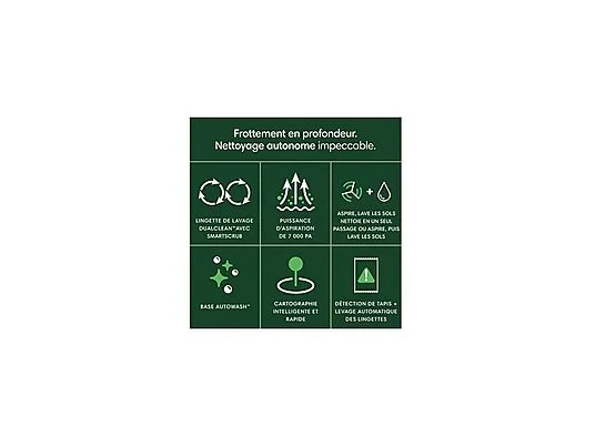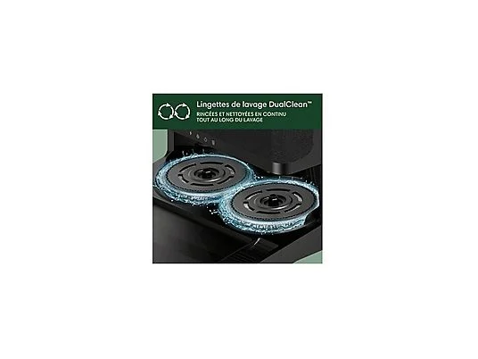 - Fregado Avanzado: Utiliza el sistema DualClean con mopas giratorias y tecnología SmartScrub, que aplica presión al suelo para un fregado profundo, capaz de eliminar manchas difíciles.