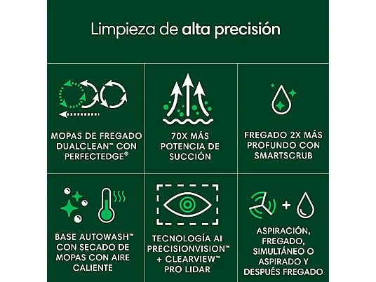 - IA PrecisionVision™: Esta tecnología de Inteligencia Artificial permite al robot reconocer y evitar obstáculos comunes como cables, calcetines y desechos de mascotas. Además, usa la información sobre la suciedad para priorizar y ajustar los ajustes de limpieza de forma automática, garantizando una limpieza profunda donde más se necesita.