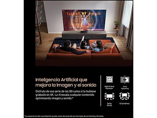 - Q-Symphony: Sincroniza simultáneamente los altavoces del TV y una barra de sonido Samsung compatible para un audio verdaderamente envolvente (Dolby Atmos y Adaptive Sound Pro).