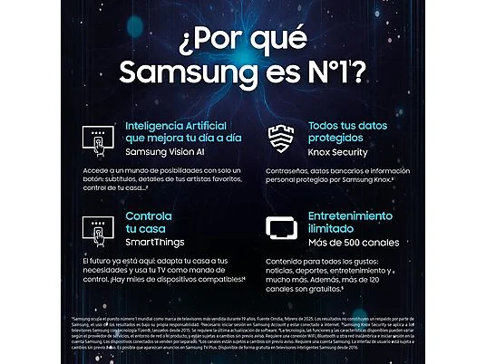 El Samsung TQ55QN70FAUXXC es un televisor de alta gama que redefine el concepto de Smart TV, utilizando la inteligencia artificial más avanzada para mejorar la calidad de imagen, el audio y la gestión del hogar digital.
