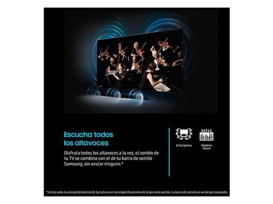 - Q-Symphony: Tecnología que sincroniza el sonido del TV con el de la barra de sonido de manera simultánea (sin silenciar el TV), creando un audio más envolvente. Compatible con OTS Lite.