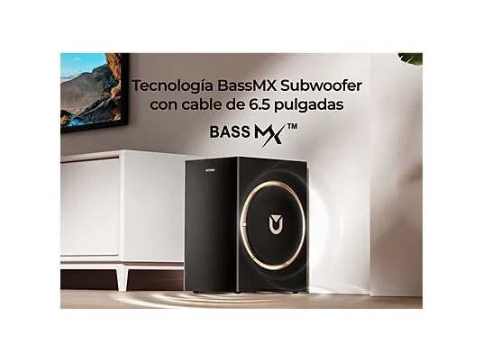 Subwoofer BassMX™ de 6,5″: con bobina grande, excursión de 18 mm y caja de madera de 7,2 L para graves profundos y potentes.